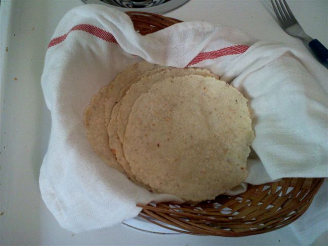 I saw a "Tortilleria" sign in a little strip mall about 15 minutes from my house the other day, and I stopped in today to see if I could buy fresh masa for tortillas from them. Success! They went in the back and ground me up "una libra" but in reality it was closer to 4 lbs, not 1. I've been on a tortilla making kick lately, but have been using "maseca," which is a dried corn flour/lime preparation. Tortillas are supposed to taste better if you can find fresh masa, which is softened corn kernels treated with lime then ground into dough. I came home and made a batch. The dough looks quite different from dough made with maseca -- you can see the bits of corn in it. I'm still experimenting with timing and temperature of the skillet, but these came out pretty good. For some reason I find the process of tortilla-making very soothing.