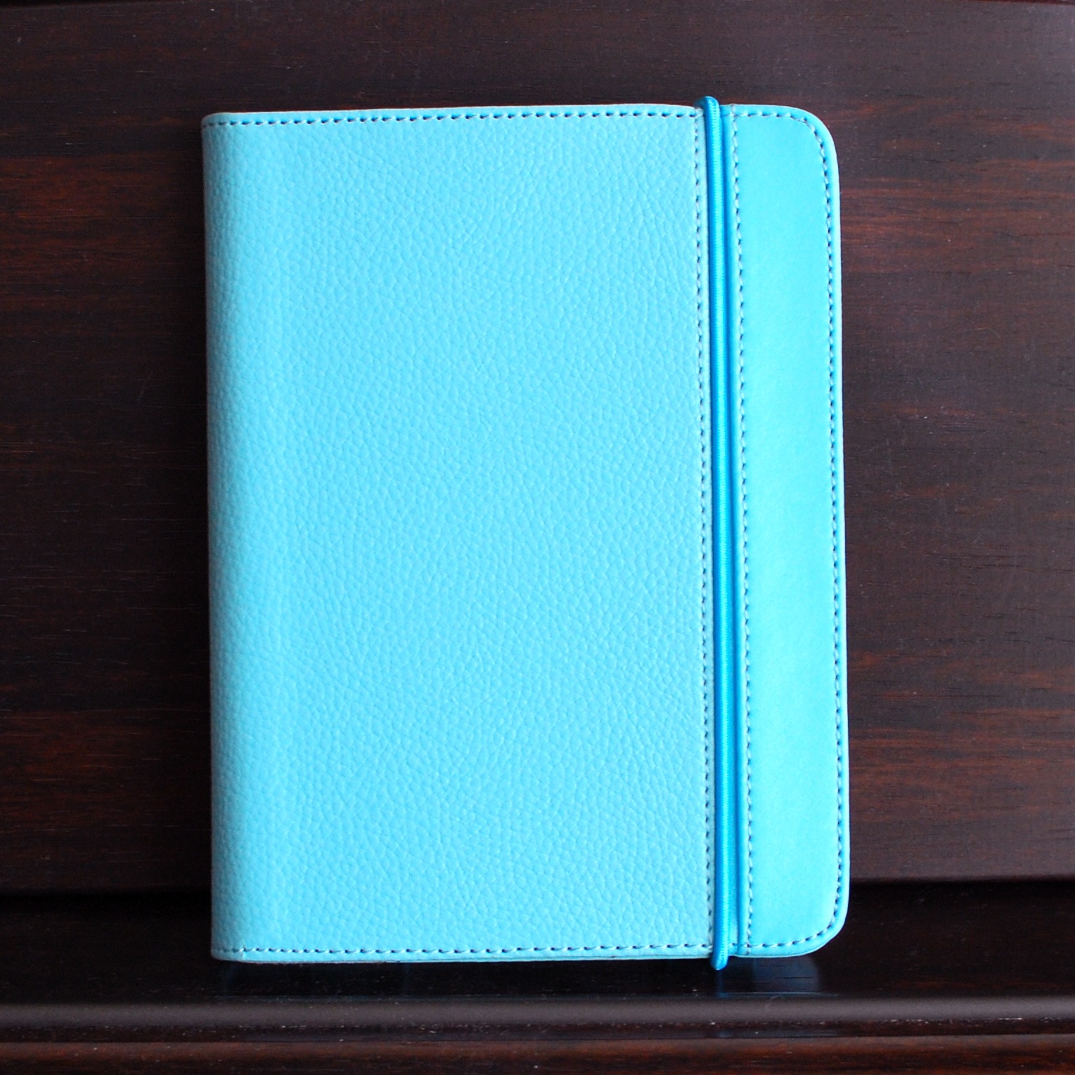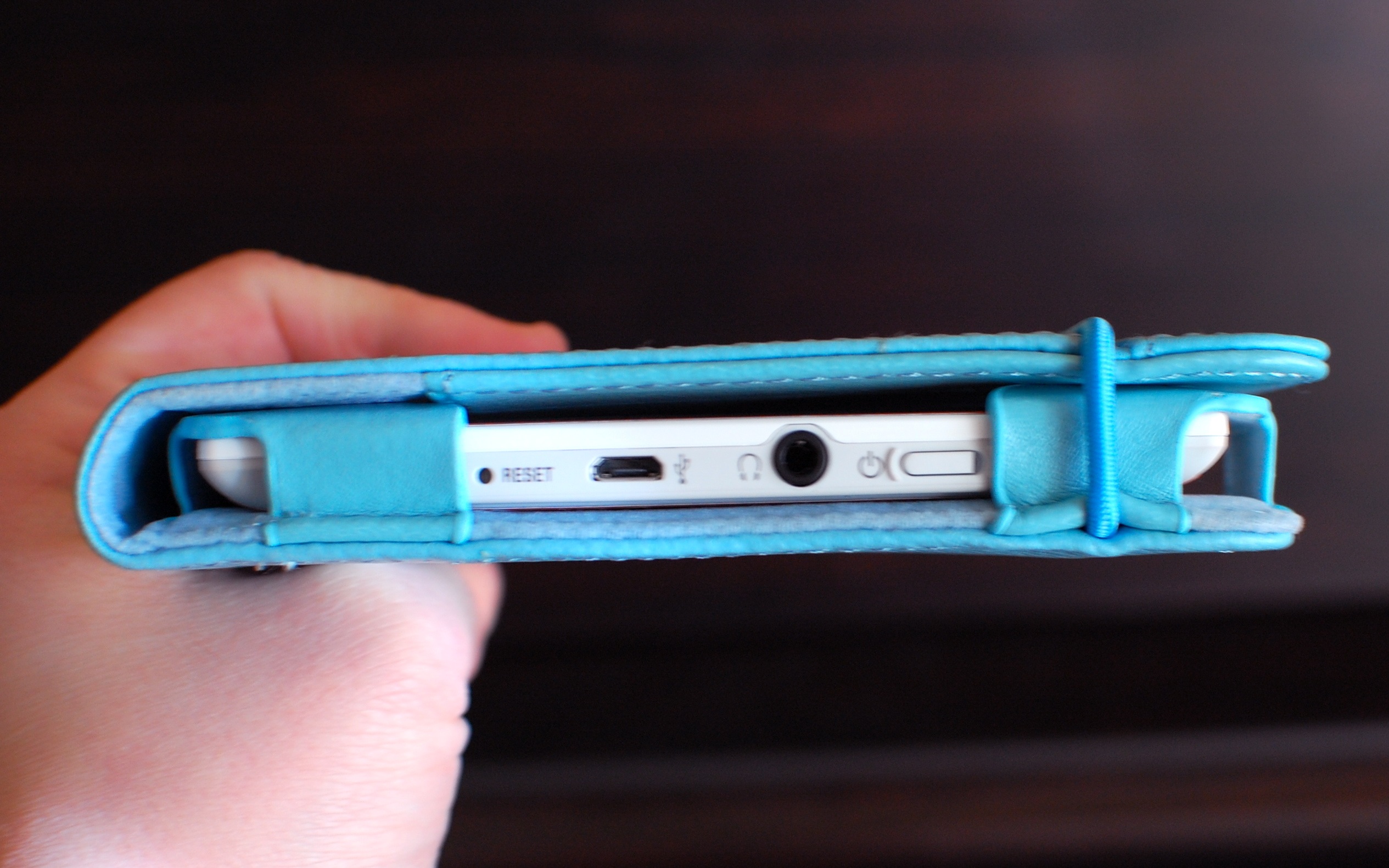 I do prefer a case-less reader, but my purse is dangerous territory. I tried the regular Sony case at Target, but felt that it was uncomfortable to hold - the tray digs into my hand. So I took a chance and purchased a mCover for Kindle Touch in Aqua, for $7.99. I'd call it more of a Robin's Egg Blue, but it is still a nice case, with a nice, pocket, and an elastic band to hold it shut, and keep the cover from flapping. It comes in several other colors. Here are pictures of the T1 in the case, and with my preferred book light. The Kindle Touch is a bit wider, but the friction of the case lining keeps the T1 secure - no wiggling. And the corner pieces don't obscure the buttons like most of the other Kindle cases. |