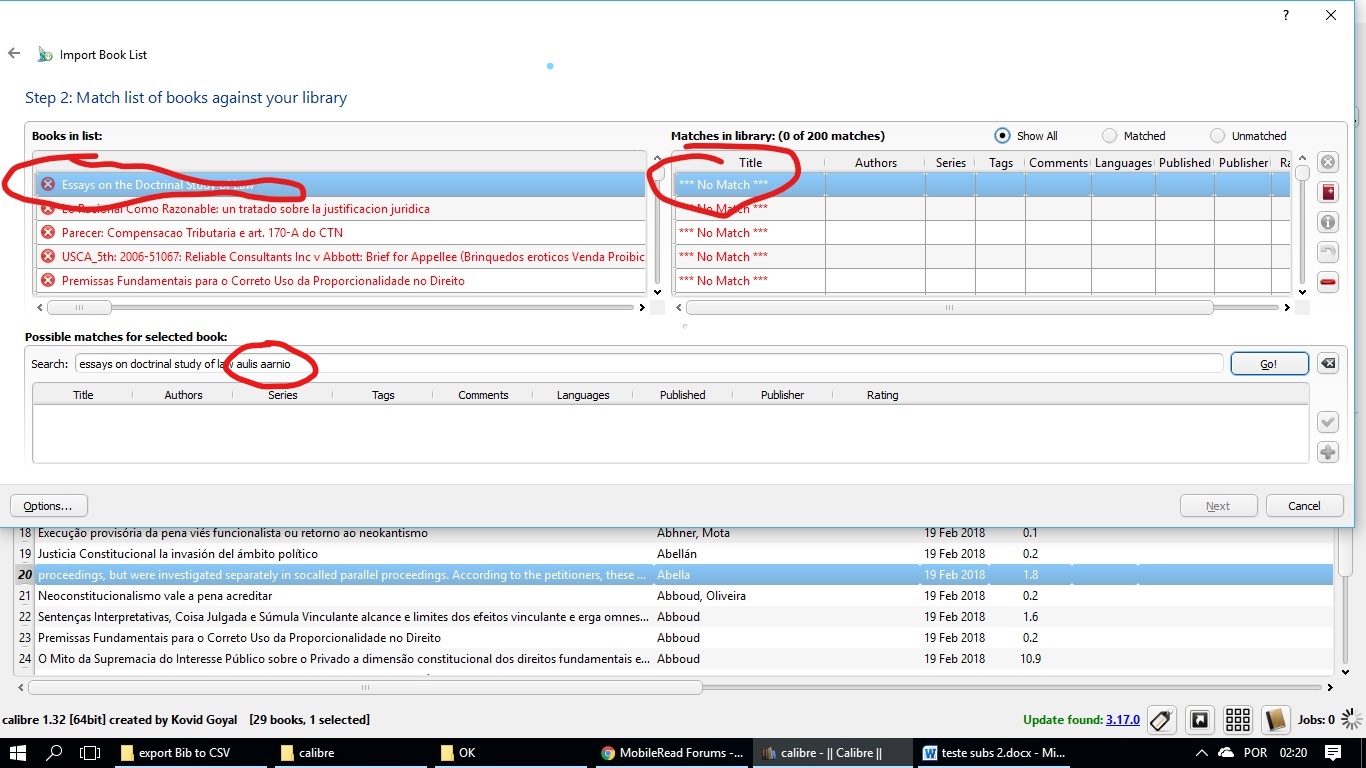 I'm migrating my extensive library from mendeley. To do that, I exported my files from mendeley with the filenames: “AuthorLastName – BookTitle” I added the mendeley files in calibre, extracting the metadata. So, my books in calibre contain only the author last name and the title. Next, I exported a csv file with the complete metadata from mendeley. Then I tried to use this awesome plugin to update the incomplete calibre metadata. So, the plugin would update the incomplete book entry in calibre with the complete metadata from mendeley. The problem was that the plugin never matches the books that I had added, because it searches form the author full name, and I only have the last name in calibre. So, the plugin doesn't match the metadata in the list to the book entry in calibre. If I manually edit the plugin wizard search to remove the author first name, making it search only for the last name, it matches the book already in the calibre library and updates its metadata correctly. Trouble is I have a very large library, so manually editing the search is unfeasible. Is there a way to make the search on the wizard use only the author last name as a parameter? In other words: to make the plugin wizard match the calibre entry only by the lastname of the author. In other words still: to remove the first name from the plugin wizard search criteria. That way, the plugin would automatically update the incomplete calibre metadata (author last name and book title) obtained when I added to calibre the exported files form mendeley with the complete mendeley metadata. Or does anyone have another suggestion? I attached 3 printscreens for clarity. The first shows the books added from mendeley with incomplete metadata (authorLastName - BookTitle). The second shows the matching problem. And the third shows that the plugin matches the existing books if I remove the author's first name from the search. Thanks in advance. |