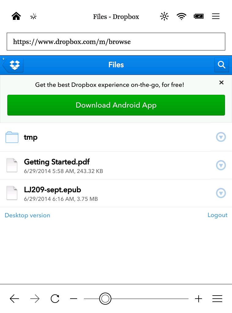 Edit: These screenshots are from my Glo, the first is the view I get when I first sign in to dropbox, the second is after I have tapped the "Desktop version" button and then selected a file by tapping the space to the right of the filename. Last edited by GeoffR; 12-08-2015 at 01:58 PM. Reason: Added screenshots |