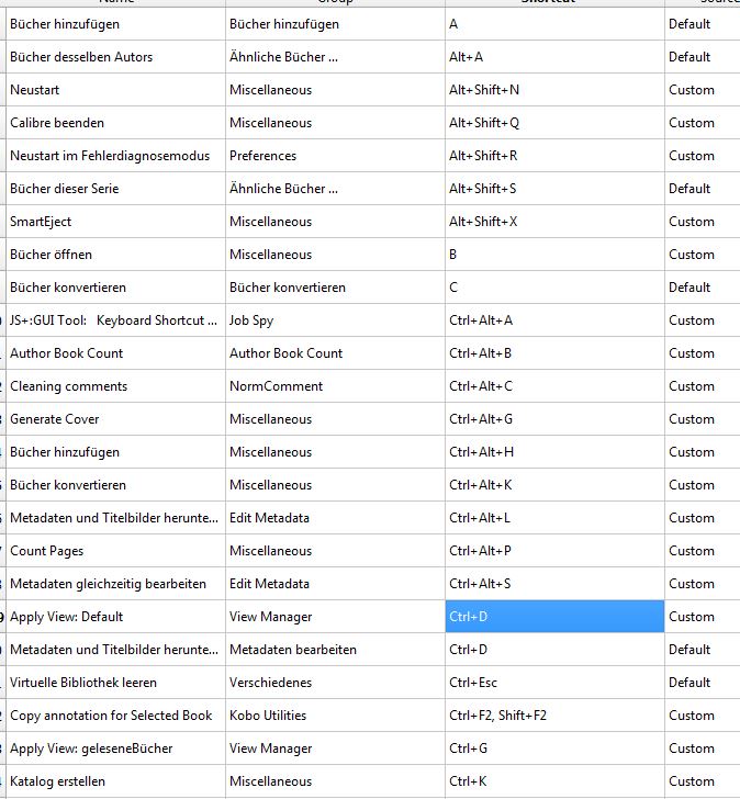 Thanks a lot for that. Very helpful and nice handling. But I wonder why inactive shortcuts are shown as well. Maybe not all but at least some e.g. add books: although I adjust it, the list shows both i.e. my setting and the anactive "A", same for Virtual Library and some others. And more confusing when I use the Standard shortcut for something different. In that case it is shown twice in the list. e.g. I use Ctrl+D to open View Manager for Default view and not for Downloading Metadata. That works well but list shows both. Could you please have a look nto this. |