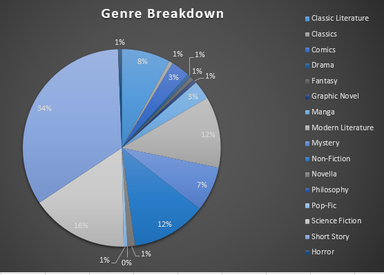 I am pleased with my reading thus far. 108 Books. 54 short stories. I am most pleased with hitting my "read more non-US authors" challenge. At the year, I am at 49% American authors and 51% non-American. I want to get it even lower next year! I might try to incorporate reading more female or non-binary authors as a challenge as well. Geeky charts attached. |