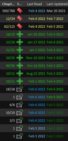 Thank you. As for what I'm doing -- the rule's for Last Read column. books 2 - 10 all match the checks. The others are using colours_daysbetween(). Before, either book 1 (currentlyreading) or books 11-17 (not currentlyreading) would be uncoloured, depending on where I had colours_daysbetween() Last edited by ownedbycats; 02-07-2022 at 10:47 AM. |
