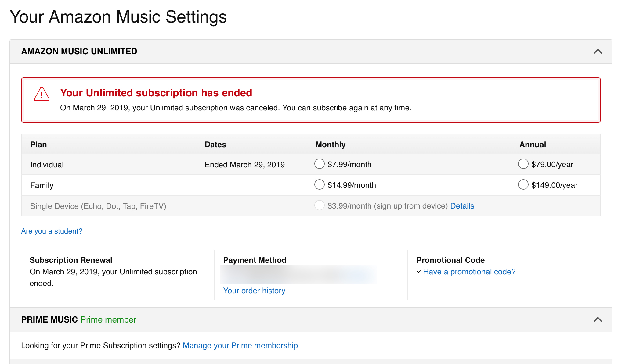 Anyone else notice the death of Amazon Prime Unlimited Music plan that was $3.99 for a single device? I had that plan until about two months ago when Amazon changed it to the $7.99 individual plan without so much as an email to warn me. I tried to change it back, but cannot find the cheaper plan even listed any more. Sorry Bezos, but I'm not helping you pay for your divorce. Keep your zipper up and the prices down! Unlimited is just not worth $7.99 to me because I don't listen that much.