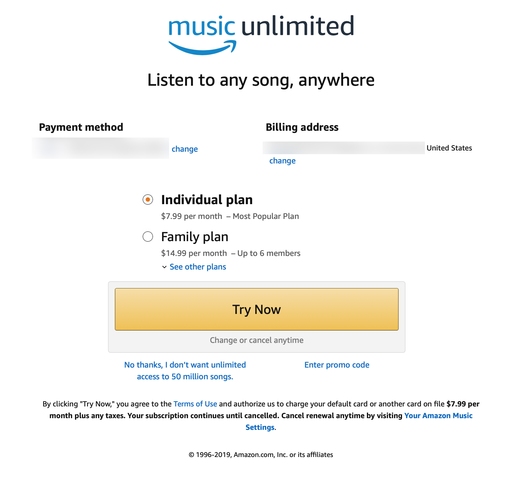 "Stream on a single Echo or Fire TV device. To change your current subscription to the Single Device Plan on your preferred Echo device, say “Alexa, downgrade Amazon Music.” Your subscription will change to the Single Device Plan at the end of the current term, at which point music streaming will be limited to your preferred device." |