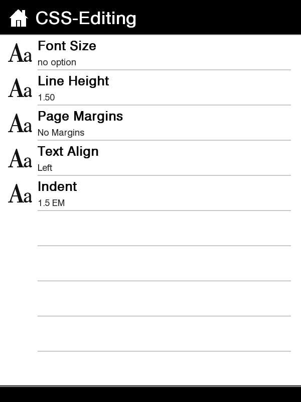 Is it possible to make an OPTION(group) callable from within a book (say with a button)? Reason for asking: I have allready made an optiongroup in PRS+-options which makes it possible to alter style.css in a flexible way. It lets you choose/combine you own font-size, text-indent, line-space, text-align, ... This functions more or less well. Ebook will reload automatically. Now it would be nice not to close the book for altering this options and therefor calling this options from within a book similiar CSS-styles in PRS+. In other words: Is it possible to make a action which calls this option(group)? Thank you very much A. |