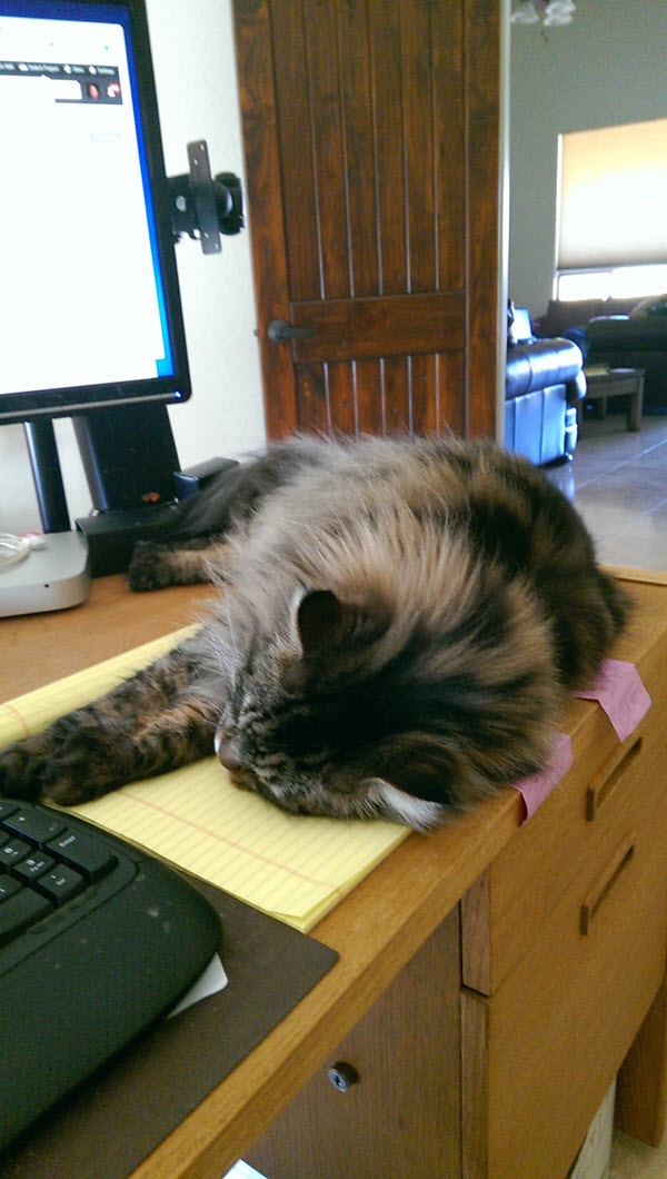 But as (most of) you all know, I've been a skoosh under the weather and the desk cleaning project has been in abeyance. Anyway, one of Mr. H's big complaints was that I was making it hard on the CAT, because he didn't have a place to lie, "comfortably," amirite? So, today...yup, I finished cleaning up the desk. Totally immaculate, oak top sitting there all nekkid and stuff. Now, ask me--is the g*dd*mned cat lying on it? HE IS NOT. He's avoiding it, like I've ruint it. Instead, he's lying 5 feet away, on a heavy-duty black yard trash bag, currently filled with the shreds of all the paper items that were shredded, in the great desk (and office, to some extent) clean up. SO GLAD that I could make the CAT happy. I knew this would be the outcome--both of them, and now he alone--only liked lying on it when it was covered in nice, soft, squishy paper.(sigh). (the attached, by the way, was taken years ago, when Zep was not quite full-grown. As you see, he will find the nice soft paper, no matter what. IMHO, I've now totally ruined the desk for him....) Hitch Hitch |