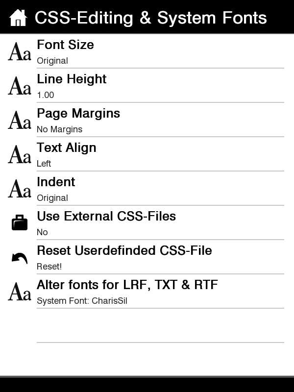 Other way round: The reason I want to do that is this: 1) I can change CSS-settings with several option-points from within PRS+ - options. No problem. Option value is stored automatically. 2) I can change CSS-settings from the Font-Size overlay too. This is done by calling another function which will manage it. But the chosen value should be stored in the optionfile responsible for the function in (1). So same value is displayed when going into PRS+ - options again later on. Otherwise the old value is displayed. Edit: the stored option-value has just the to be there to display the chosen value in PRS+-options. No calling up on starting the reader or whatever... A. Last edited by Analogus; 04-06-2012 at 01:12 PM. |