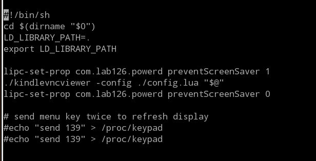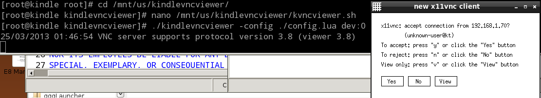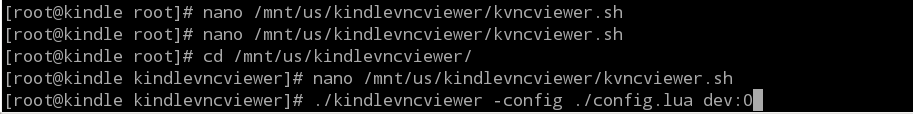is yours???? (on my kindle dev = 192.168.1.1 but I unrolled the first call to show this) [root@kindle kindlevncviewer]# ./kvncviewer.sh 192.168.1.1:2 Quote: