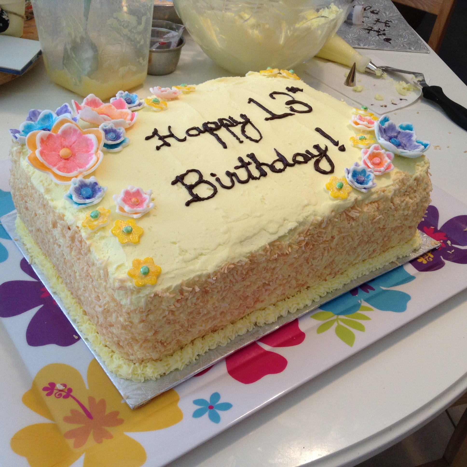 Piña Colada cake with pineapple filling, coconut frosting and handmade fondant flowers. From scratch. I am pleased with myself.