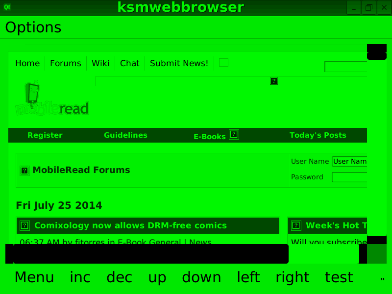 Since several FW updates nickel rotates the screen. Under older FWs, I converted the screenshots made on a Kobo Touch by using the values 800x1280, this resulted in an acceptable image, but with a huge black border on one side; or using the values 800x600 with results in an acceptable image without additional border. (This is at least how I seem to remember it.) Now, with recent FWs, I convert with the values 608x1792 (I find these values with fbset). This results in an acceptable image, but with an even huger black border as before. So this should somehow be improved. I did not yet really look into this. Making screenshots by executing a script file via fmon, is not very convenient, because of the timing problem. It is much easier do make it via telnet. If you really want to do it via fmon, try this. KSM provides the scriptfile .kobo\kbmenu\fmonsh\run_test_script.sh, which is associate with kbmenupngs\run_test_script.png. The script file is empty, as its purpose is to be ready for tests. For simplicity let us use it now. The new content for .kobo\kbmenu\fmonsh\run_test_script.sh is Code: