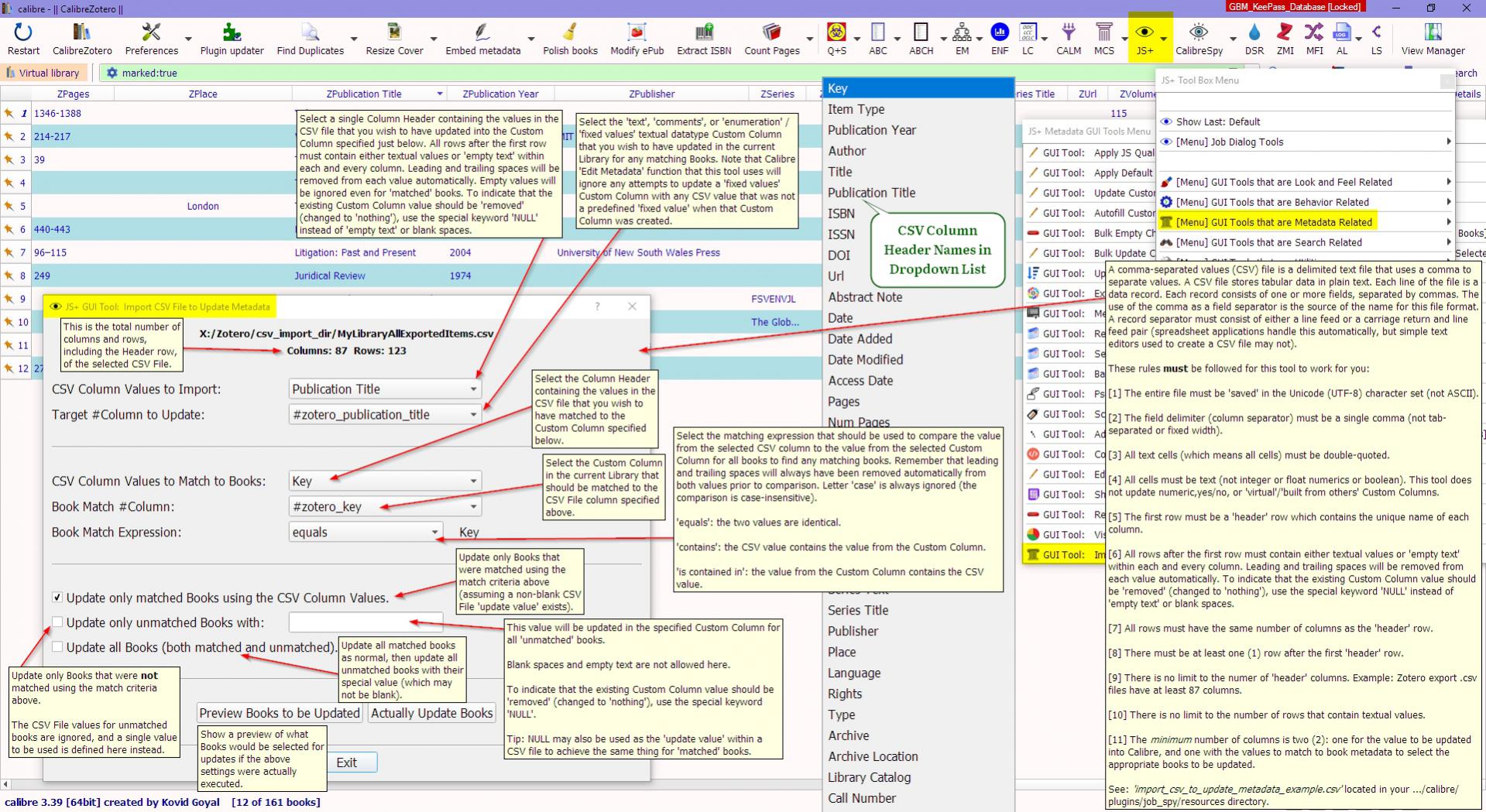 Version 1.0.145 - 2019-03-08 "Import CSV File to Update Metadata" match logic changes for tag-like Custom Columns.