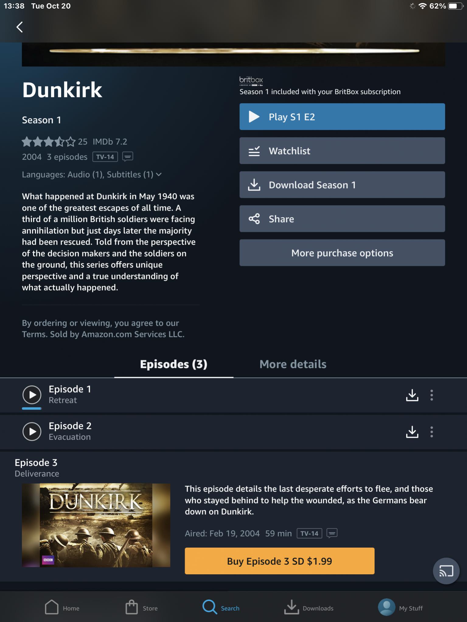 ![]() ETA: Added screen capture from Prime Video app on my iPad showing Dunkirk docudrama in the BritBox channel page. Note how it says “season one included in BritBox subscription” but shows episode 3 available through purchase only. ETA2: I found this link on the BritBox website explaining why this sometimes happens on the Amazon Prime Video BritBox channel: Quote: