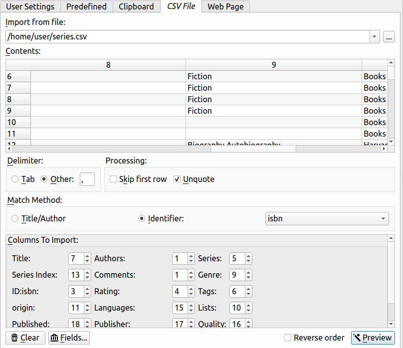 Is there any chance of allowing the author and/or titles to be pointed elsewhere? As long as the columns match the format for author/title? I use the plugin to import my Goodreads .csv (export library .csv) and the Goodreads book titles are much different from the edited Calibre titles. This makes the import take forever (I have some 3500 books in Goodreads). I created a "Goodreads Title" column and have been copying it to the title column when trying to import. This takes a while to do, and requires me to copy from the original Calibre title to a holding title column, and the Goodreads title to the Calibre title, and then back after the import. Each time I do this it requires Calibre to totally change my library. If I could just point the title in the list to the title column I have set up, I could avoid doing this. Same for the Authors. Also, is there a way of setting the plugin to NOT exclude special characters? "&", and "." is being dropped and it causes some of my titles/authors to not match. Finally, it would be great if the plugin could have a feature that would remember matches. I am finding that the same books are having to be manually matched up each and every time (thus the reason why I have that Goodreads Title/Authors columns). Thanks, and I love the plugin otherwise! |