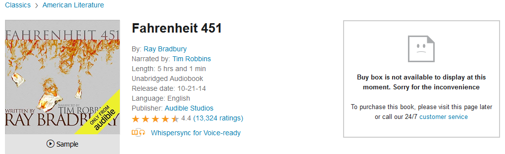 Well, Downpour's Black Friday Deals link still doesn't work and the hourly title is still the same. But, I stumbled across this super top secret sale ![]() It seems that all of Downpour's Rental Titles (17,000+ titles) are on sale for $0.99 each. So if there's a book you want to listen to, but not buy, and it's not available in your library, then now's your chance. So hurry before this super top secret sale vanishes into a nearby black hole ![]() Downpour Rentals Quote: