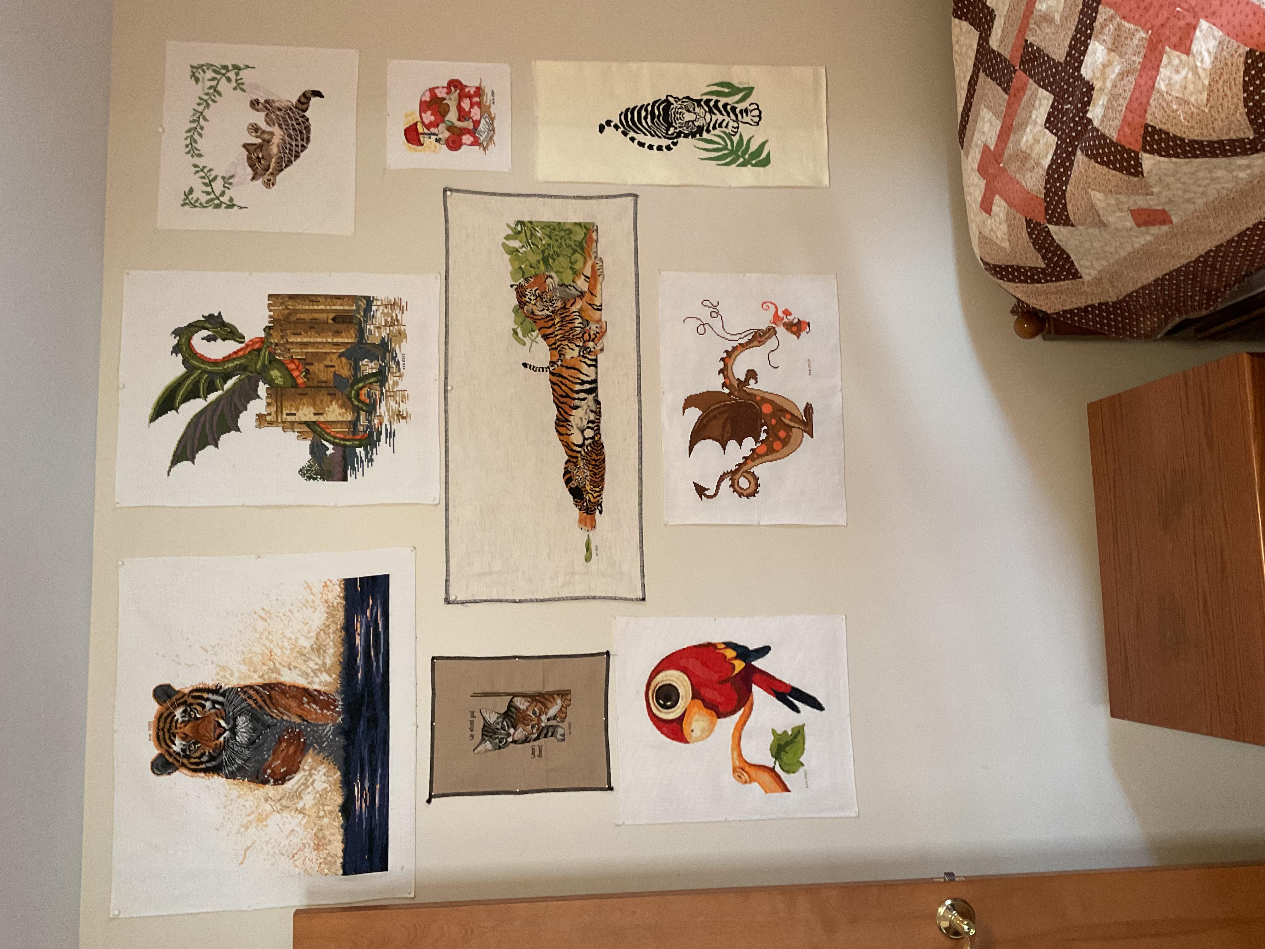 I’m hanging some of my cross stitch pieces (photo below). I like to enjoy pristine walls for a while, in a new place, before I decorate. It’s been 1.75 years, so I’m at the decorate stage, and company will be here over Christmas, to see it.