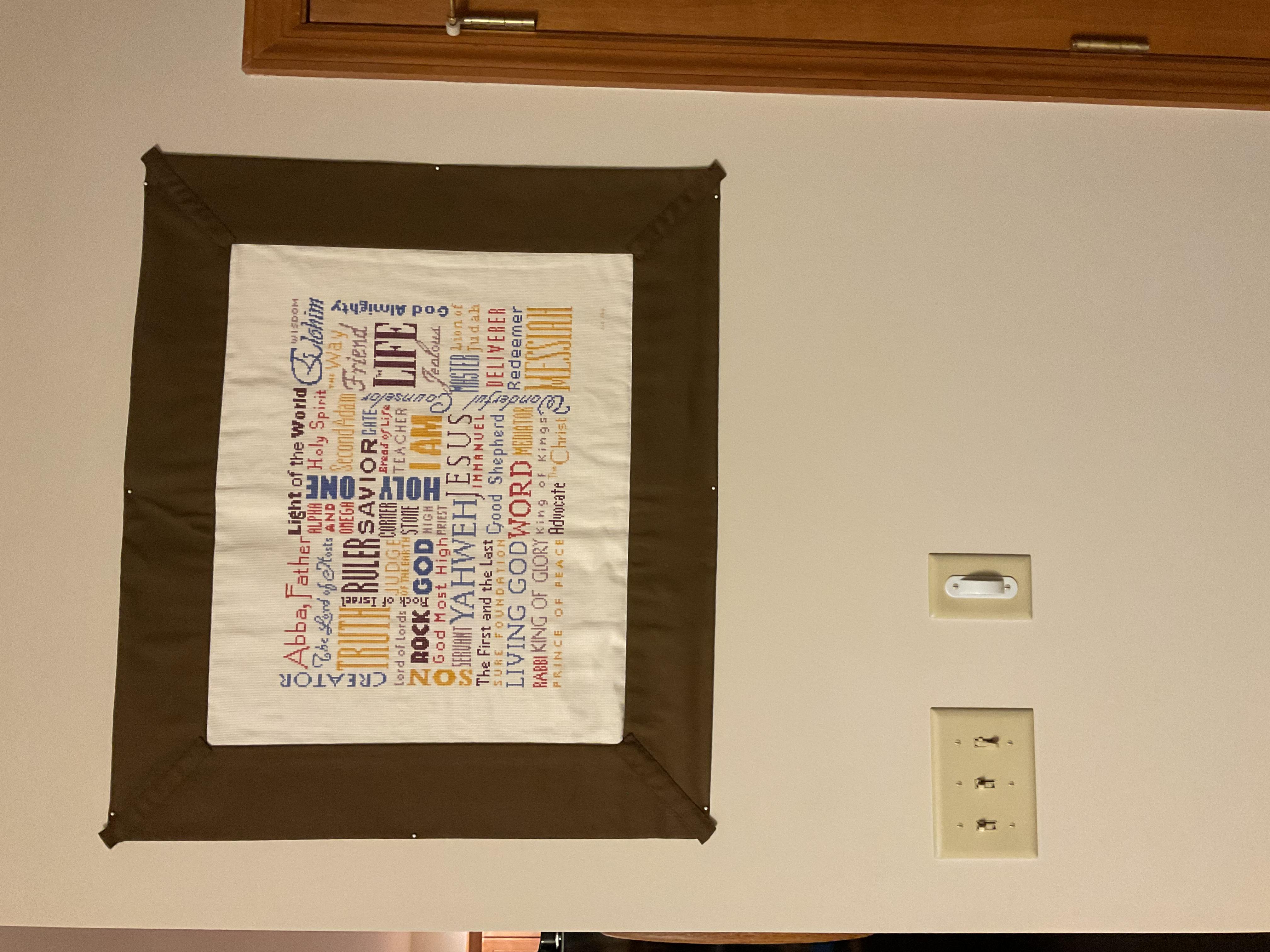 As more of a fabric person, I’m lately “fabric only” — so I like them without frames. Some of my earlier ones have frames; I’ll hang them elsewhere, so they don’t clash. On one large wordy piece, I created a 2” wide dark brown fabric border, to emulate a frame without being one.