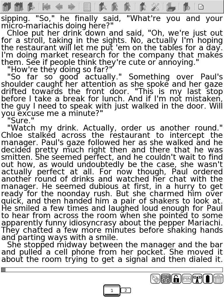 Attached: FBReader .8 reading the zText format from manybooks. I haven't released it yet because there are some screen refresh and file size issues I need to work out.