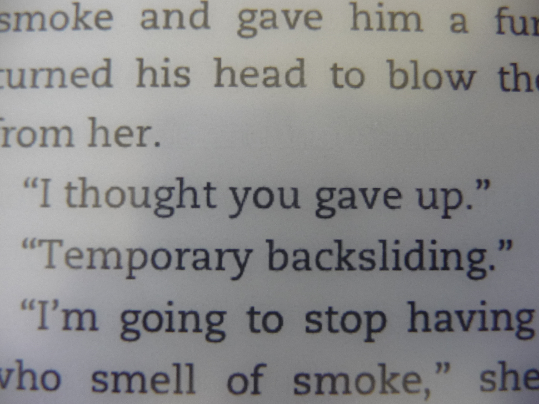 Image on right is fuzzy, after numerous page changes. In the photo, the word "up" seems to show the most letter distortion. The image on the left is a fresh display after a refresh triggered by viewing the "more"window. Notice the word "up" is now crisper. The photos are poor and the effect is subtle, but noticeable. So far I cannot replicate the more severe ghosting seen before. The fuzzy text is still legible, but it is a slight nuisance to have continually variable display quality. Less annoying than the page turn flash I have seen on the original nook.. Thanks for all the feedback. Last edited by SteveDuck; 06-10-2011 at 06:54 PM. |