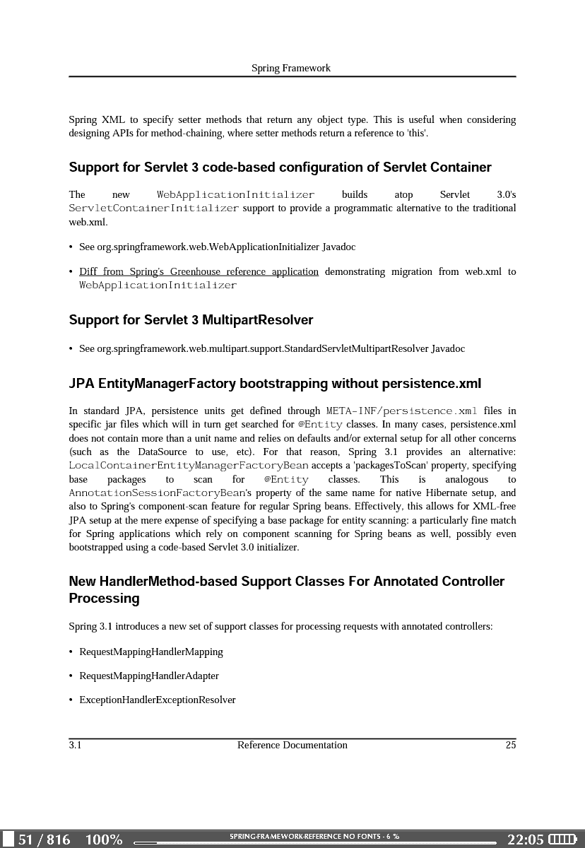 1) spring-framework-reference original.pdf is a technical PDF with the necessary fonts embedded (in fact has embedded just a subset of any font -> this means you don't have to have the font to view the pdf but you have to have the font in order to edit the pdf) 2) spring-framework-reference no fonts.pdf same pdf as 1. but with no fonts embedded (I removed the embedded font subset ![]() Pdf2 because has no embedded font will be seen with the PB90x local fonts (I expect to be better than those created for windows and embedded in pdf1) ![]() Please take a picture if you find any difference when showing page 51 for pdf1 then pdf2, ![]() PS: do not use the reflow mode ! |