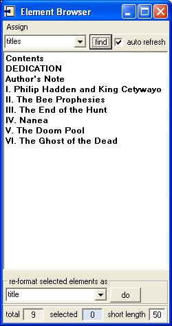 In the body of the window there's a box that shows the results (one line per match). Clicking on a line takes you to it in the main window, so that you can fix the text, for example, merging a sentence that has incorrectly been split in two. You can also select multiple elements and convert them to something else (selected in the bottom list selector). For example, you can change several titles to subtitles, etc. This is the most useful feature of Book Designer and the main reason why I still process my ebooks with it before loading them in Sigil. I would like to see something like this implemented in Sigil, working in Code View. I would use the same window structure and the choices could be: headings, italics, bold, CSS class selectors, broken paragraphs, bad paragraph ends, empty paragraphs, pictures, tables, links. Another useful thing would be to be able to move the inline styles created by Sigil (sgc-1, etc) to a CSS stylesheet. |