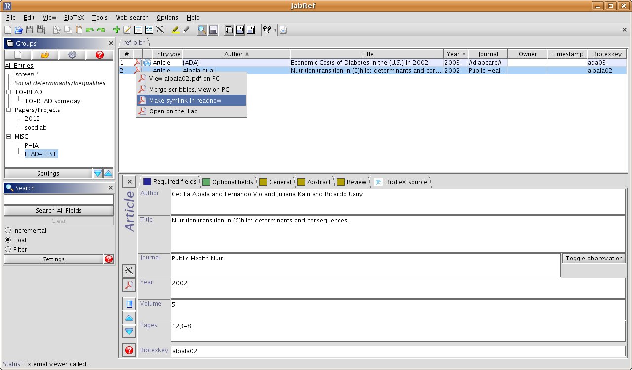 I also have another export filter that creates symlinks, so I can select a group of refs, export to symlinks and move the symlinks to some work folder on the iliad. That way I can keep all my refs in one folder and have collections for particular projects in another that point to the original articles. But when you have hundreds of articles and no bibliography manager on the iliad using the iliad search becomes a pain. So, I have installed samba as shown recently (thanks ajnorth!) on the iliad and access it from my PCs. I have setup some scripts and registered these as external file handlers in jabref (this is much simpler than it might sound, it's like setting up file associations in Windows 98 or something) and the scripts themselves are quite simple. I then network my PC to my iliad and setup an article entry to do different things depending on which option is chosen. The choices are: i) open and view the PDF on the PC ii) Merge the PDF and scribbles and view on the PC iii) Make a symlink in an easily accessible folder on the iliad so I don't have to search for it iv) open the PDF directly on the iliad (via ssh) (The last option works in that it opens the PDF and was what I was after in the first place, but I have trouble closing it afterwards and might have to give up on this approach.) Here's a screenshot showing the choices. I might even try to make a video and put it on youtube if people are interested and if I can figure out how to do it (never tried youtube before). Jabref is really nice. I am really getting to like it. At the moment I am liking the static and dynamic groups. And it looks like there will be a plugin for OpenOffice soon (it is already in the dev version). |