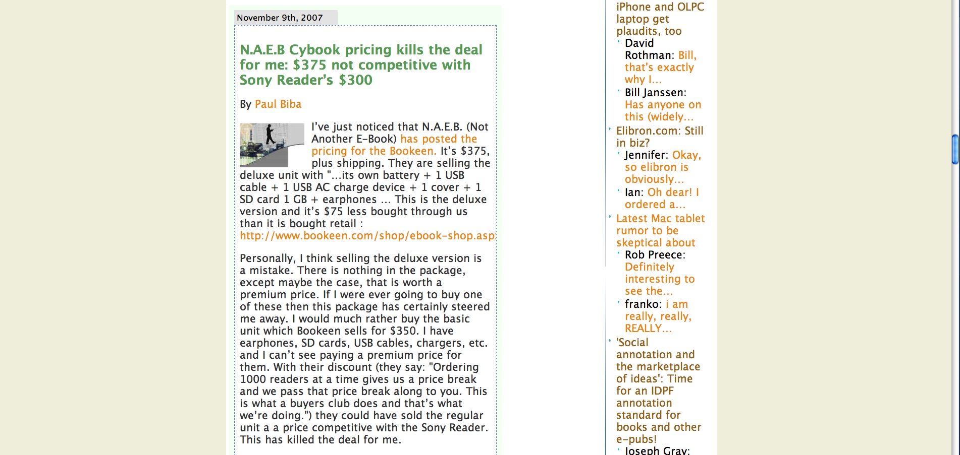 that i read over at teleread, to see how it compares to my messages. -bowerbird N.A.E.B Cybook pricing kills the deal for me: $375 not competitive with Sony Reader’s $300 By Paul Biba I’ve just noticed that N.A.E.B. (Not Another E-Book) has posted the pricing for the Bookeen. It’s $375, plus shipping. They are selling the deluxe unit with "…its own battery + 1 USB cable + 1 USB AC charge device + 1 cover + 1 SD card 1 GB + earphones … This is the deluxe version and it’s $75 less bought through us than it is bought retail : http://www.bookeen.com/shop/ebook-shop.aspx." Personally, I think selling the deluxe version is a mistake. There is nothing in the package, except maybe the case, that is worth a premium price. If I were ever going to buy one of these then this package has certainly steered me away. I would much rather buy the basic unit which Bookeen sells for $350. I have earphones, SD cards, USB cables, chargers, etc. and I can’t see paying a premium price for them. With their discount (they say: "Ordering 1000 readers at a time gives us a price break and we pass that price break along to you. This is what a buyers club does and that’s what we’re doing.") they could have sold the regular unit a a price competitive with the Sony Reader. This has killed the deal for me. |