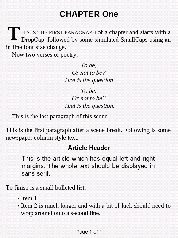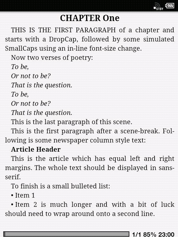 It's a long time since I used FBReader (on my PocketBook 360), but I seem to remember it completely obliterated the styling niceties. I never did get round to trying CoolReader. It's quite possible both apps have improved a lot. I've attached a one-page epub containing various typical styles found in epubs. The default Sony app displays all styling with no problems. I've also attached a screencap of what it looks like on a Sony 650 (I didn't use the T1 because I don't have a screencap app for it, but I'm pretty sure I can make it look exactly the same.) Edit: I should add that I have used a customised font, not the Sony default. If anyone can spare the time I would love to know how close to the original you can get using one of the Android reading apps. I haven't rooted my T1 yet as I haven't seen a 'killer app' which will tip me over the edge ![]() In addition, for any Calibre fans who use either the Catalog or News features (both highly styled epubs), are any of the Android reading apps practical at all? Last edited by jackie_w; 01-05-2012 at 04:02 PM. Reason: add |