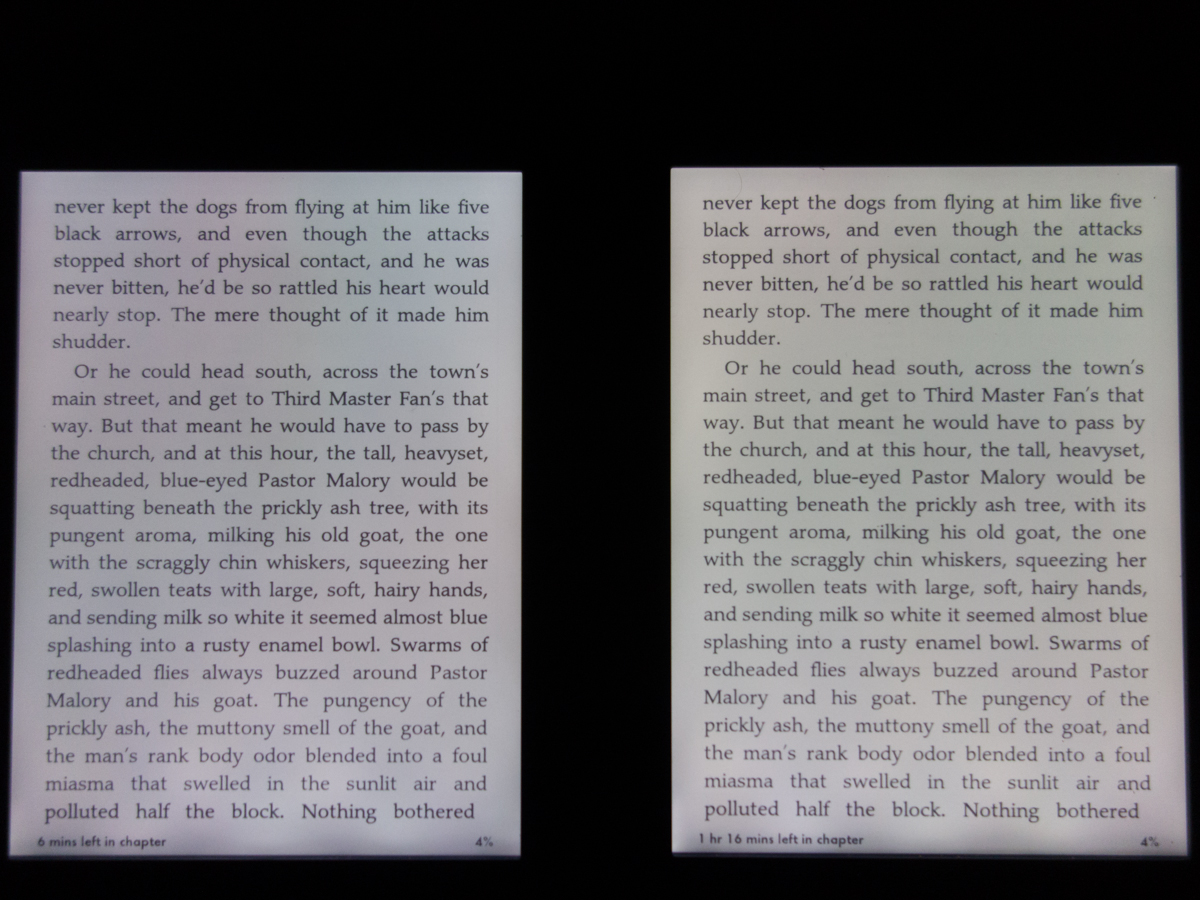 I realize they don't appear dramatically different in the photo, but viewing side by side with my eyes the replacement is quite a bit better, and shows no color in actual usage (nor do I remember seeing any when I took the photos). Nor will I ever have the screen light turned up to 24 in dark conditions, except perhaps as a flashlight. Also I find the replacement has slightly darker text which is of course welcome. So I have a Paperwhite with a screen which meets my expectations fully, and I'll be sending the original one back. |