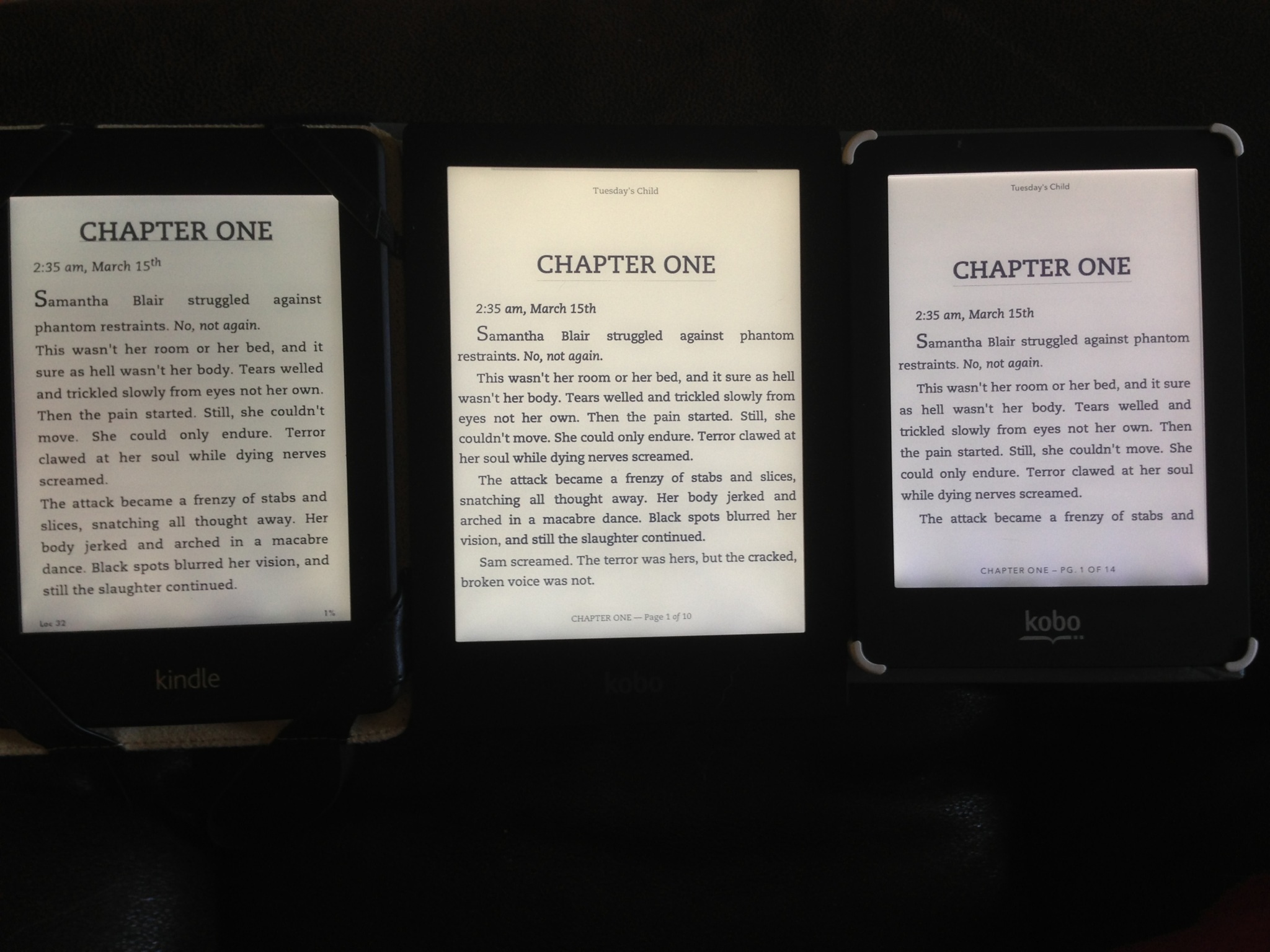 Here is a poor pic of all three with the same book in the same font. It was a freebie in the stores so no conversion or sideloading.