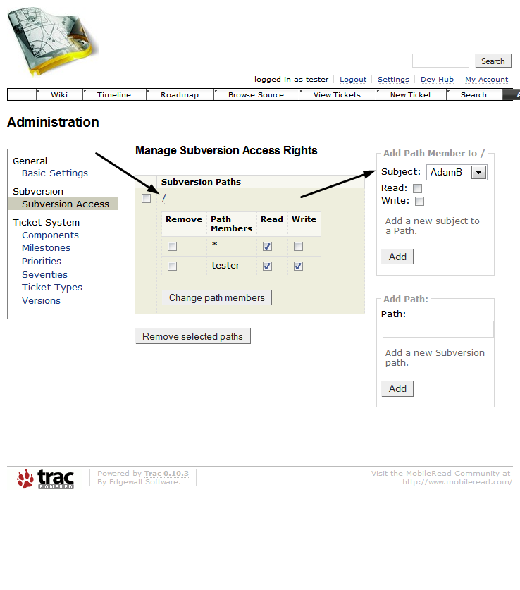 Is the manage subversion access right page correct? I do not see how to change things. Is it possible to add specific users so they can check in code?
