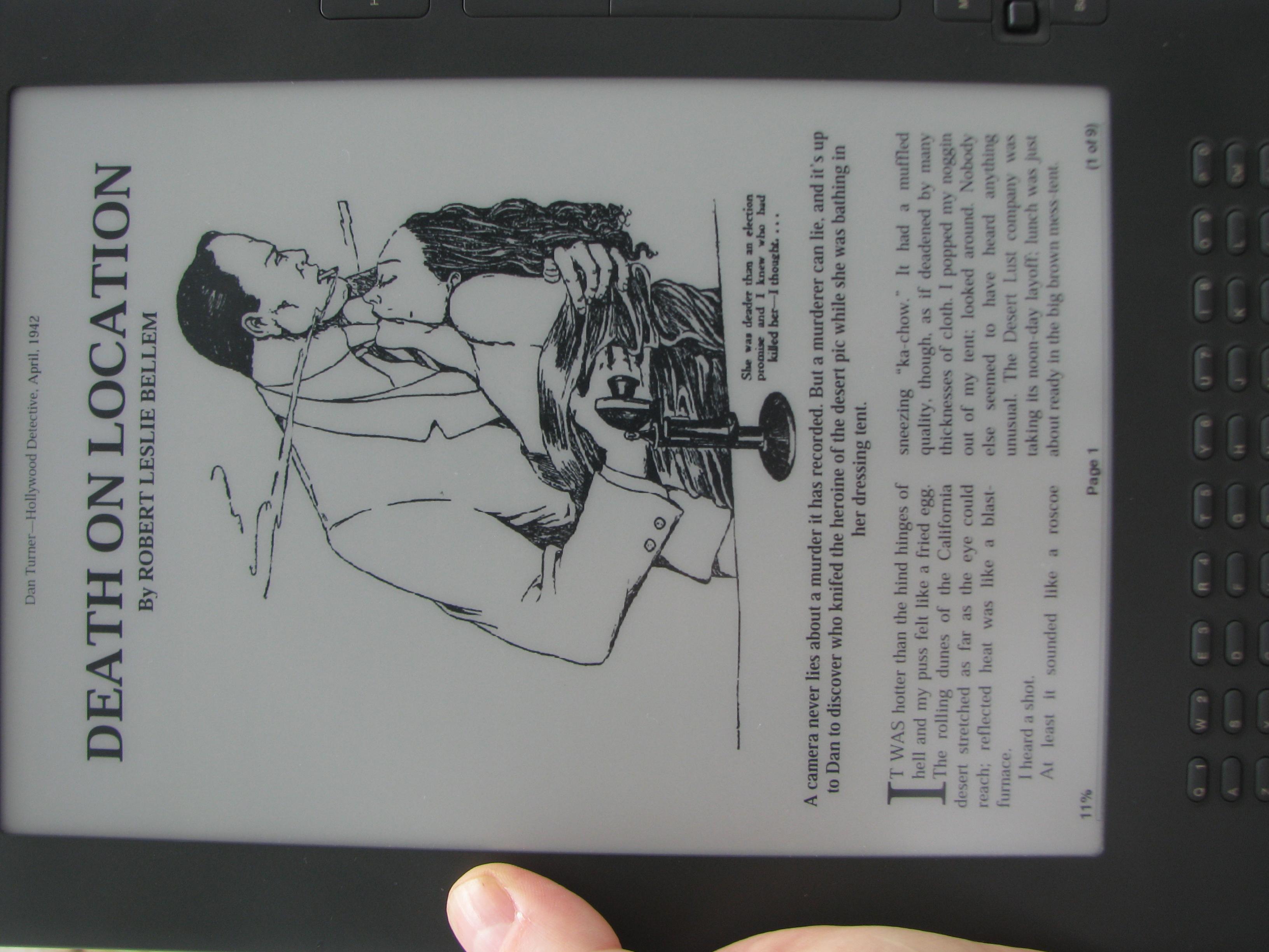 Reading on this, in normal lighting, is a joy. Reading old pulps on a Kindle DX-G is like watching a sumo wrestler doing ballet: Can something really be this elegant? YES! [The fuzziness is due to hand-holding this while taking the photo. Make no mistake: The letters are crystal sharp.] Last edited by Dr. Drib; 01-12-2014 at 10:50 AM. |