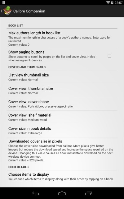 Choose the maximum resolution of covers imported from Calibre. More pixels give better images but increase download times and storage requirements. Changing the value causes all book metadata to download on the next wireless connect.