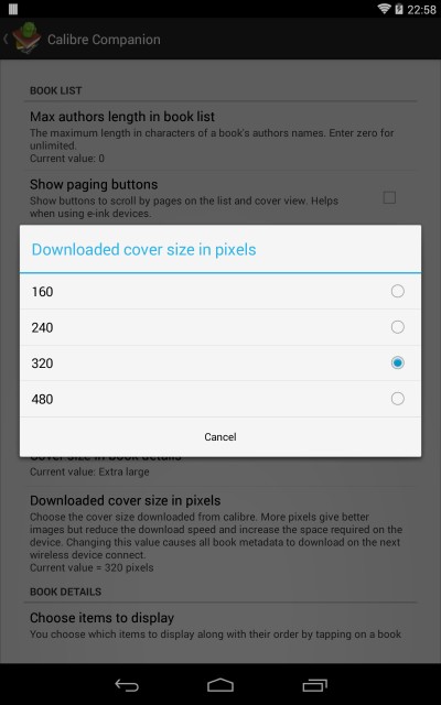 Choose the resolution of covers imported from Calibre. More pixels give better images but increase download times and storage requirements on the device. Changing the value causes all book metadata to download on the next wireless connect. (Default = 320 pixels)