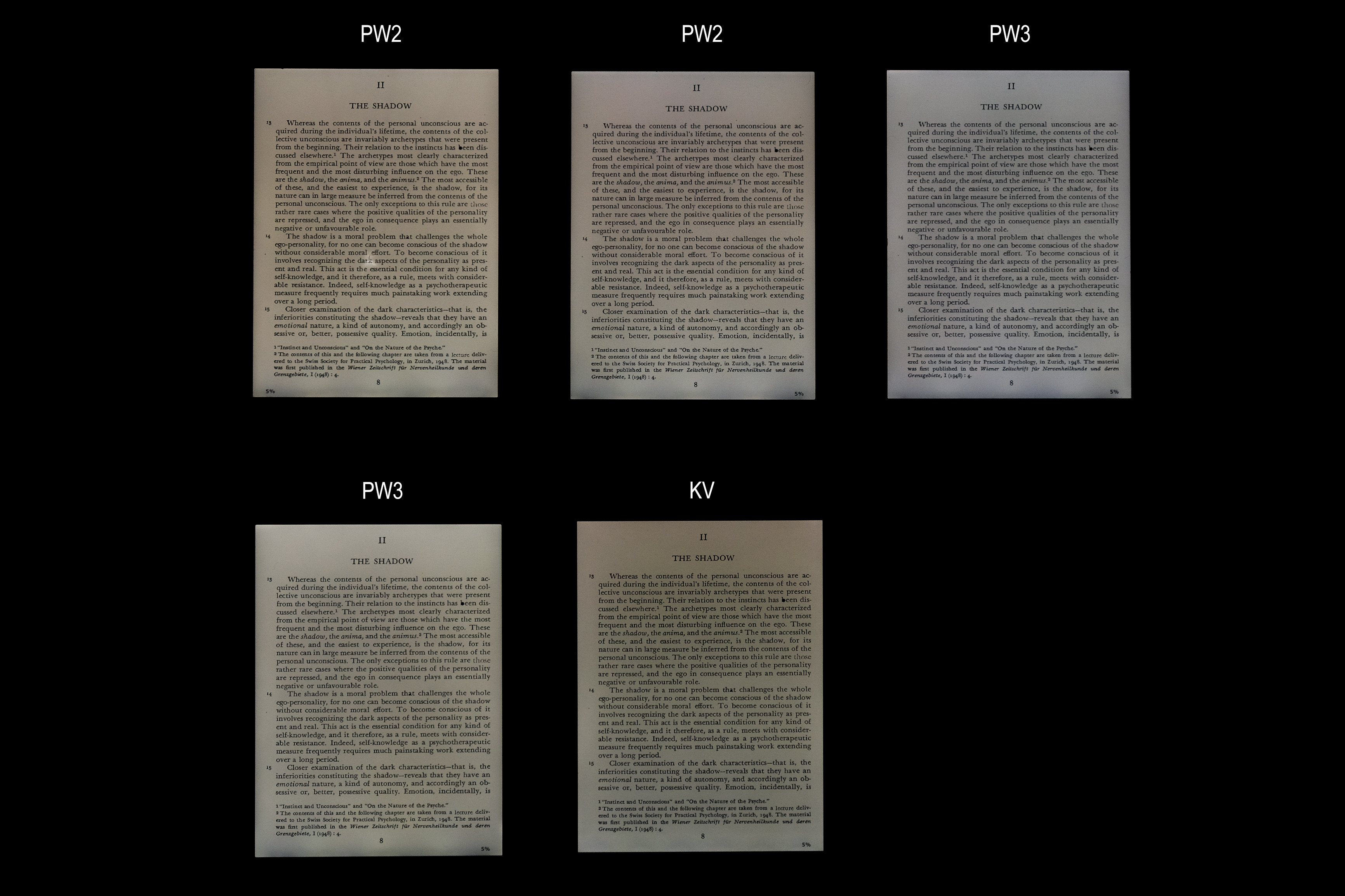 I compared 2x PW2, 2x PW3 and 1x Voyage. All the Kindles were set to brightness level 10 (max. is 24). The second photo was oversaturated +100% using Adobe Lightroom in order to better see the differences. If you look closely you can see the 5 LEDs on the bottom of all Paperwhites. On the Voyage you almost can't see them, but the LEDs on the bottom seem to be whiter then the ones on top (this is more evident on the oversaturated photo). My plan is to do a lot more photos with different brightness settings and at least 7 more PWs and one more Voyage. They're currently bricked but I'll try to unbrick them in the course of the next few weeks. |