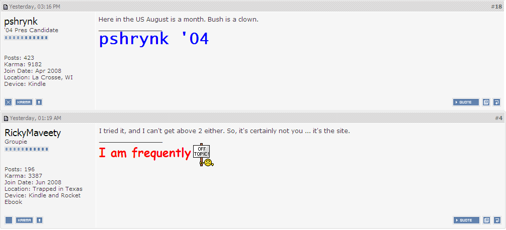 I have to agree, igorsk, though I enjoy both of those people and their posts immensely, a thread full of giant signatures is a bit distracting.