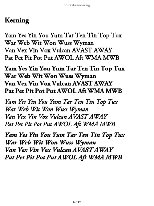 Good: * optimizeLegibility seems to be able to access your font's kerning info (if it has any), even if you haven't forcibly added Old-style Kerning pairs. |