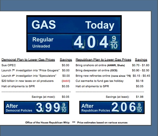 Methodology: Retail gasoline prices are the result of literally hundreds of factors including crude oil supply, global demand, refinery capacity, regulation, taxes, weather, the value of the dollar, etc. Therefore it is impossible to say with certainty what one individual action will do to the overall price. However, based on what we know about the impact of crude oil supply and prices it is possible to develop some potential ranges of impact on gasoline prices for certain policy changes. For example, using the methodology employed by Speaker Pelosi and House Democrats that suspending shipments into the Strategic Petroleum Reserve (between 40-77,000 barrels of oil a day) would reduce gas prices by at least 5 cents, bringing ANWR online (at least one million barrels of oil a day) could impact gasoline prices by between 70 cents and $1.60. Last edited by Madam Broshkina; 07-01-2008 at 10:03 PM. Reason: spelling |