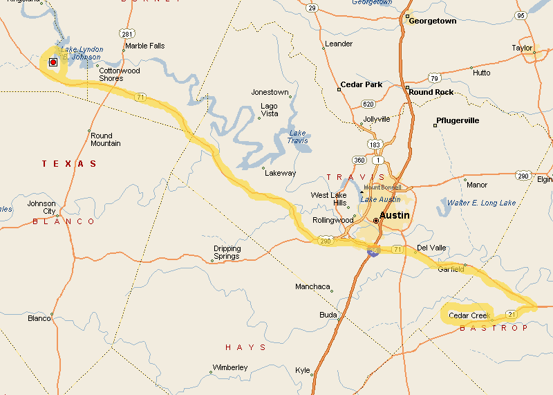 Although I've been in that area ... I came very close to purchasing a few acres in Bastrop County a year ago or near then ... Oh .... maybe something less than two hours ... might only be an hour and a half. I'm right off of 71, which looks like it ends right above Cedar Creek. Well, let's put it this way ... it takes me about an hour to get to the ABIA (the Austin airport) from my house. Last edited by RickyMaveety; 07-03-2008 at 05:31 PM. |