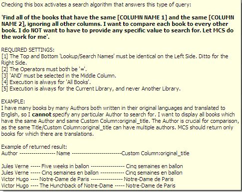 See the attached image of the tooltips. Note "REQUIRED SETTINGS" item "[3]": 'AND' must be selected in the Middle Column. By design, MCS automatically 'jumps back' to 'AND' plus the other required settings whenever you attempt to use "Inter-Book Search". It doesn't tell you that you disregarded the explicit tooltips instructions; it just corrects your mistakes and continues with the search. MCS can use regular expressions to do 'fuzzy searches', but only for 'Intra-Book' Searches. MCS 'Inter-Book' Searches only use the '=' operator, as indicated in the yellow tooltips. The comparison is done implicitly, not explicitly, entirely within SQL using a collating sequence of "exact match, not case insensitive". MCS 'Inter-Book' Searches are an entirely different animal than 'Intra-Book' Searches. DaltonST |