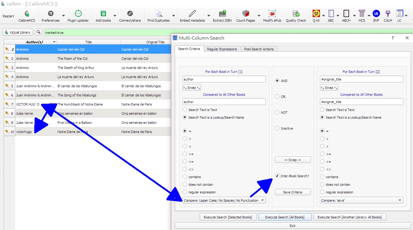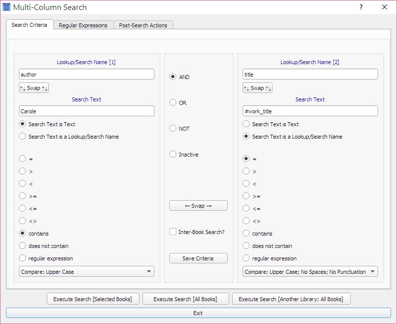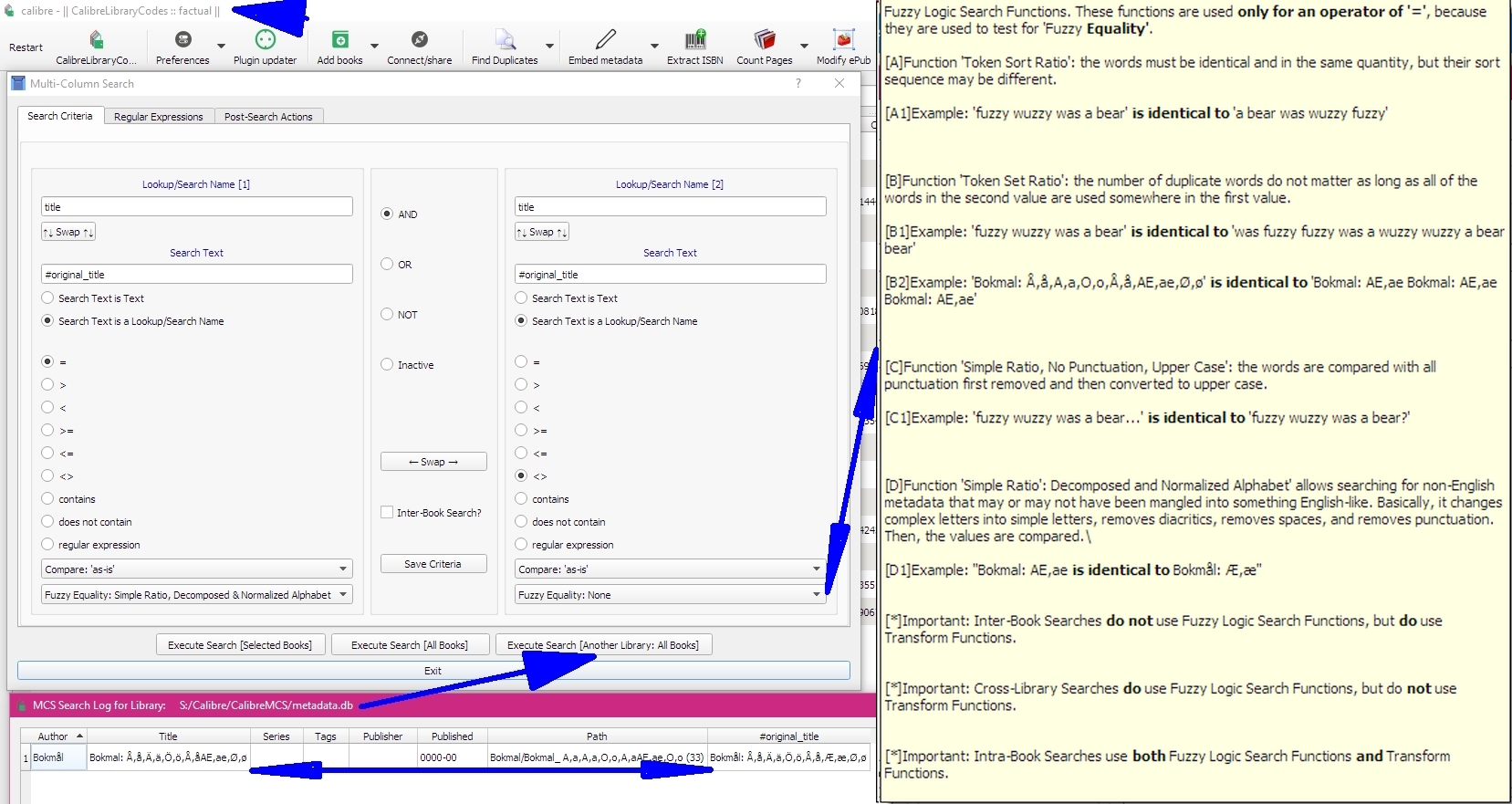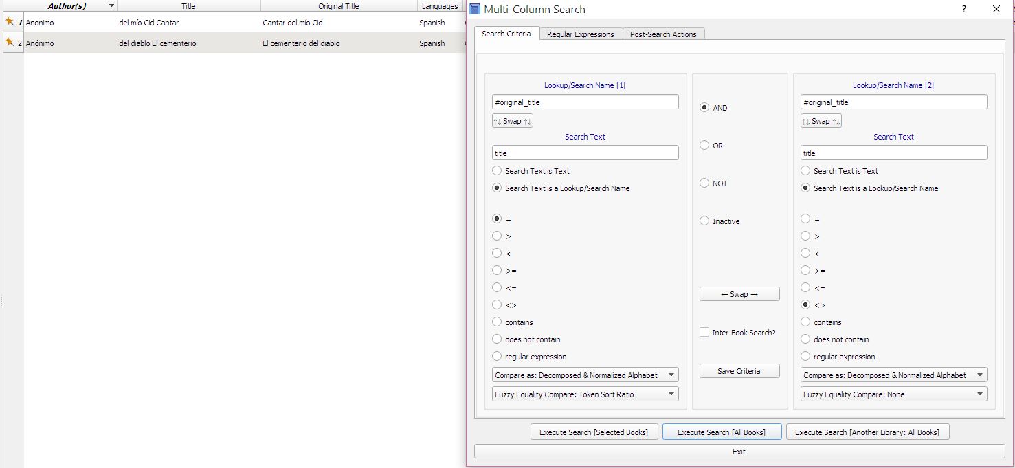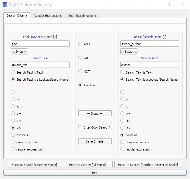 That's what I WANT to do. But every time I select Inter-Book Search and change the for each Book to the proper respective titles, I also change the middle column to NOT. I'm assuming that's what I want. BUT, when I click the Execute Search (All Books), it jumps back to AND. And THAT does not get me what I want. Intriguingly, the result IS interesting. I get the books that have Multiple instances of that title. I ended up with three 'sets' of books. In two pairs, the same title was used by two different authors. In the other instance, I had found two different formats of the same book. Thus, I was able to prune the dupe. Not a bad accidental result. BUT, is it possible to get what I was hoping? (and shouldn't conditions that change upon clicking an execute button, at least pause to inform the user why and offer a cancel opportunity?) So, to be clear for reproduction: I check ON Inter-Book Search, change the Left column For Each Book field to title. I change the Right column For Each Book field to #origtitle. I click the NOT radio button in the centre. Then I click the Execute Search [All Books] button. The radio button changes to AND and proceeds, taking, in my trial case, 303.656 seconds. There does not APPEAR to be any way to cancel the search. Thanks for this tool. I have the impression it WILL be a wonderful tool once I understand the intracacies. Indeed, I tried using title in both For Each field, finding all the books that DO have duplicated titles. (It DID allow me to fix SOME of the metadata'd changed titles BACK to the correct one and then do a manual update) Does MCS use exact (or case ignored) searching, or does it use the same fuzzy searching calibre uses, ignoring starting articles in the title? Appreciate your time and efforts, as always, GM Last edited by Gary_M_Mugford; 11-25-2015 at 04:26 PM. |