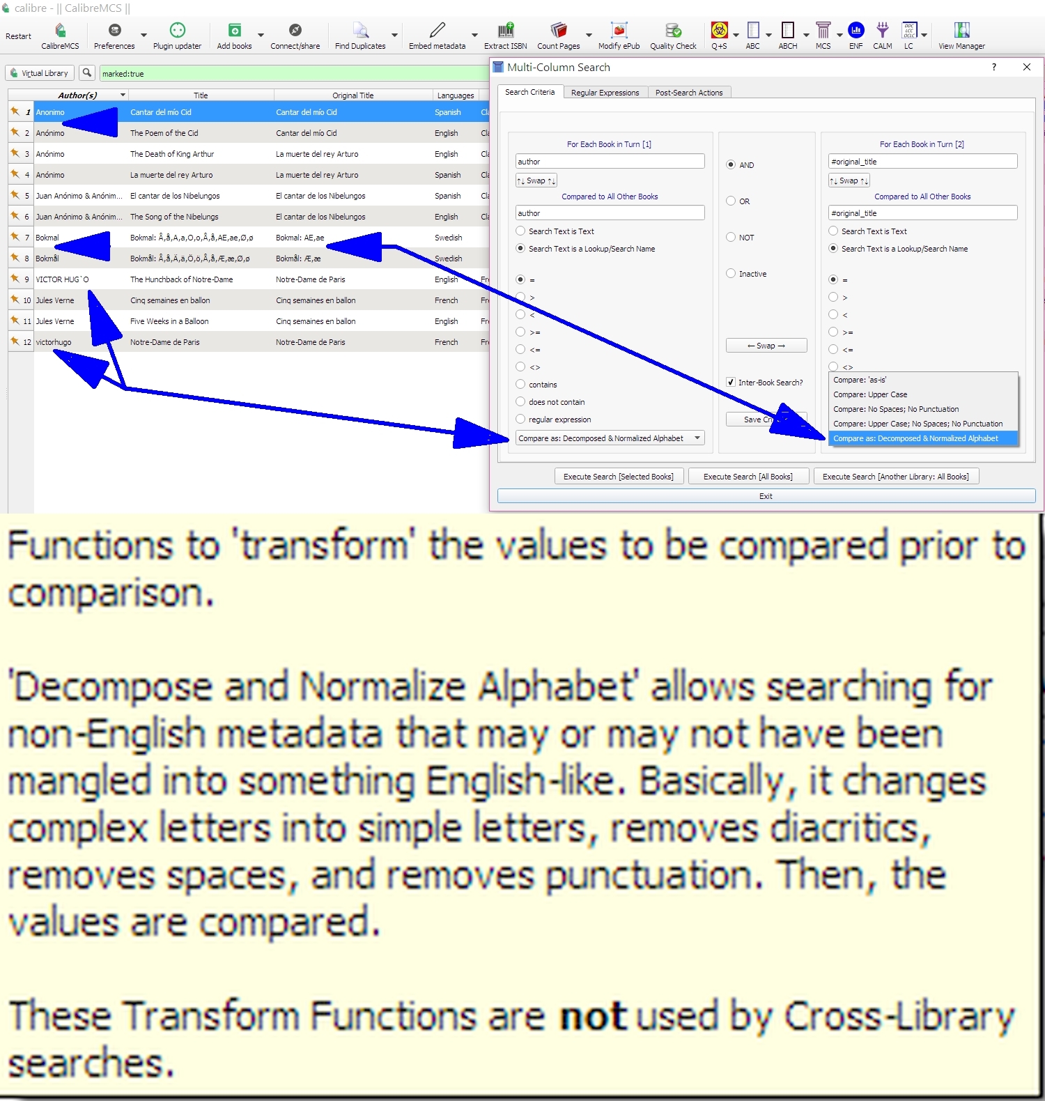See the attached example from Version 1.0.20. One word of caution: The greater that a particular metadata language's alphabet drifts from the Roman alphabet, the less accurate the new 'Compare as: Decomposed & Normalized Alphabet' Transform Function will become. Western European languages should (of course) work accurately, but Chinese, Japanese, Korean, Thai, and so forth will be (at best) much less accurate. The only Eastern European language I tested was Polish, and ĶźŽ was viewed as equal to KzZ for the purposes of searching, so it is likely that most of the Slavik languages will work well. Obviously, if all of the metadata is properly spelled in a particular language, then of course the search will work perfectly. The issues arise when they do not. For example, assume that the original title in Polish contained "ĶźŽŦ", but the translated title contained "KzZF". That would fail a check for equality, because the letter "Ŧ" does not transliterate to an "F". MCS would say they are different for that reason alone. DaltonST |