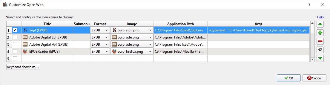"C:\Program Files\Sigil\Sigil.exe" -stylesheet="C:\Users\David\Desktop\Stylesheets\qt_styles.qss" Last edited by DNSB; 05-25-2016 at 02:00 PM. |