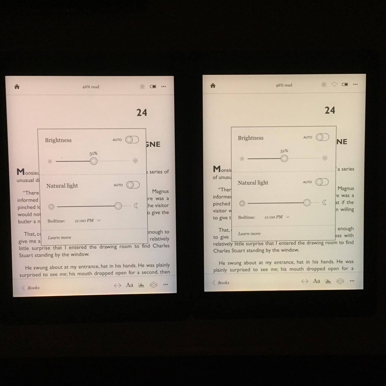 So I'm giving up the dream of a "perfect" screen and have decided to keep the old one and send the replacement back. I feel like my old one is better. Or maybe I'm just used to the placement of the "rainbow" now and seeing a slight change (not necessarily better or worse) on the new one just makes it feel like my old ones seems better. Here are some pics... Old (original one one the left that I'm keeping). The new replacement one on the right that I'm going to send back. Not sure if this helps anyone but I promised an update so here it is. Sorry the pics are blurry (smart phone in the dark) but it's not to show clarity anyway, but the shadows and rainbow colours. And for what it's worth, I typically read at night in bed with the natural light -- so this is important to me -- and usually at 1% brightness and 90% natural light as per the last comparison photo posted below). So while others may say the new one (on the right) "looks better", for me I read at the settings as shown in the last photo and I think my original one (one the left) looks slightly better at those settings. *I tried to put the lighting sliders on each reader at exactly the same spots for comparison. As you can see there is a big difference on the first pic at 100% brightness and Zero Natural light. |