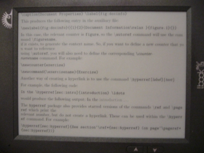 However... I successfully opened several DRM'ed Mobi files. The Mobi parser version isn't reported but it appears to be the same as the current full release. As to the ADE, it is a much better PDF reader; or at least as good as PDF can get given the inherent limitations of pretend paper. Lots of ophan paragraphs in the "reflow" modes. Graphics render nice. Opens google pdfs which didn't open with the previous firmware or OI. The epub renders are great *if* you like very small font sizes (I do) or lots of Very big sizes (which would be useful for my mother). Not so much if you like 9-12 point sizes as it looks like it jumps from 8 to 14 or 16... Only five sizes and the last two are *really* big. I suspect the DRM'ed Mobi capability is likely to vanish from the final release firmware. Unless They intend to try to slide it through... |