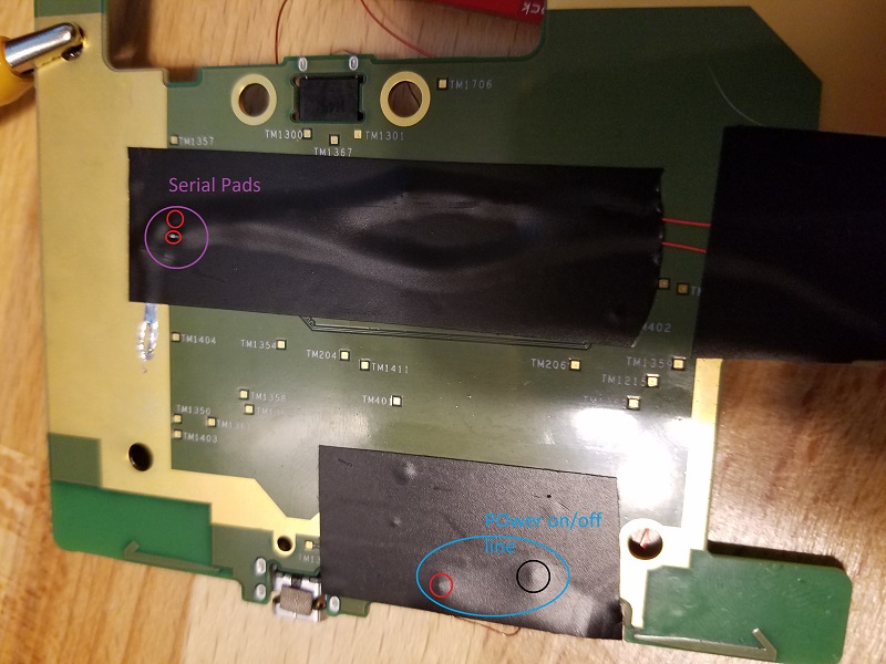 On the back of the board, I found the pads for the serial, they were labelled TM800 and TM801, this matches the 'P800 SERIAL DEBUG' listed on the front of the board. If I didn't cross the wireds board RX is on top, board TX is on bottom, matching the front. ( circled in purple ) On the back of the board the power switch is available on TM1351, I cannot match that to anything.( circled in blue ) On the big picture of my whole setup, the Orange Diamonds on the front are where the pads are on the back. I also attached all the pads I destroyed and completely ripped off, the brown circles are where pads and entire traces are missing from. |
