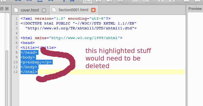<?xml version="1.0" encoding="utf-8"?> <!DOCTYPE html PUBLIC "-//W3C//DTD XHTML 1.1//EN" "http://www.w3.org/TR/xhtml11/DTD/xhtml11.dtd"> <html xmlns="http://www.w3.org/1999/xhtml"> <head> <title></title> </head> <body> <p> </p> </body> </html> I do realize I'm not do delete any head material anymore. I suppose I could leave the original xml stuff and delete what's under the <title></title> (screenshot) and then copy and paste what's under the <title></title> in the old .epub but then yeah, that brings the deleting into play. And it leads to the chance of not copying and pasting correctly. Quote: