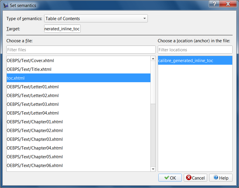 If you have issues in order to create a TOC for a .mobi, then do the following:1. In the library of this forum, there are hundreds, millars of ebooks. Just download one of them (the title of your choice) and then, open it in Calibre (since you like to work with that program). For this time, download the .epub from this link: https://www.mobileread.com/forums/sh...d.php?t=188092 2. Once the .epub is loaded in Calibre, do right click in it, and select the command "Edit book". 3. In the Edit Window you can see in the pane to left, the different .xhtml files that compone the ebook. At the very end of that pane, you can see a file named toc.ncx. This file is the TOC of the .epub, BUT THAT TOC, DOESN'T WORK in .mobi. So you need to build a TOC for .mobi from that ".toc.ncx". How to do that? 4. In the pane of the left, do click in the file Cover.xhtml. 5. Now, in the menu bar, select the commands Tools/Table of Contents/Insert inline Table of Contents. 6. Once you did that, you'll see above Cover.xhtml a new file named toc.xhtml. Do click and drag that file so it appears below the file "Title.xhtml" (or where you want). 7. Now do click again in the command "Tools" and select the subcomand "Set semantics". In the dialog that appears, in the field "Choose a file" select "toc.xhtml" and in the field "Type of semantics" choose "Table of Contents". You should have something like the following picture: Press "Ok" to close the dialog. 8. Save the changes and close the Edit windows. 9. Now do click in the buttom "Convert books" and as output format choose "mobi". 10. In the same dialog, do click where you read "MOBI Output" and there, where you read "MOBI file type" choose "both". 11. Press "OK". Now you have a mobi file (from an epub file) with a working TOC. If you like, you can open the mobi with Kindle Previewer to see how it looks. With Calibre you can generate the TOC for mobi in the process of convert the epub to mobi (as I explained in a previous post) or in the way I indicated you now. What if the epub doesn't have the toc.ncx (since from this file we have built the mobi toc)? Well, you'll have to build one How to do that?1. Open again the ebook in the Calibre Edit window. 2. In the pane to the left, select the file "toc.xhtml" (the file created in the process I described above), do right click and select "Delete the selected file" (all our work is gone ). Now go to the very end of the left pane, select the file "toc.ncx" and again, do right click and delete the file. The epub now is without a TOC and you are in the worst of all worlds Don't worry that is easy to rebuild it.3. Select the command Tools/Table of Contents/Edit Table of Contents. In the dialog that appears, select the buttom "Generate ToC from major headings" (also you could play with the others options). Press "Ok" and now, at the end of the left pane, you have again, the toc.ncx file. It was easy, isn't it? Regards Rubén |