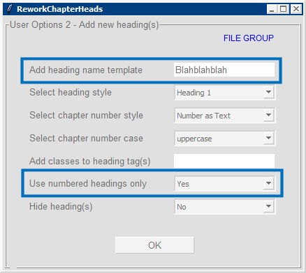 Try this: 1. Select your file group. 2.Remove/Add the heading style (ignore the Add heading name template textbox -- it isn't used) 3. Now set Select heading number style to Numeric String, Number as Text or Roman Numerals. 4. Then set the Use numbered headings option to 'Yes' and click OK. Result: 1, ONE or I (I've also just tested this in Sigil with an epub) (if Number as text is chosen then the text number will always be displayed in upper case for the Use numbered headings option only) ...And if you want headings like Word 1, Word One or Word I then don't select the numbered heading option because the numbering is separately and consecutively generated anyway by default for all selected headings using group selection only. To change your file group headings to Word I, Word II, Word III do the following: 1. Select your file group. 2. Remove/Add the heading style 3. Use add heading name and add "Word" 4. Set number style option to Roman Numerals 5. Ensure numbered heading only option is set to 'No' 6. Click OK. To change your file group headings to Word ONE, Word TWO, Word THREE do the following: 1. Select your file group. 2.Remove/Add the heading style 3. Use add heading name and add "Word" 4. Set the number style option to Number as Text 5. Set the number case option to uppercase 6. Ensure numbered heading only option is set to 'No' 7. Click OK. Last edited by slowsmile; 07-10-2018 at 10:46 AM. |