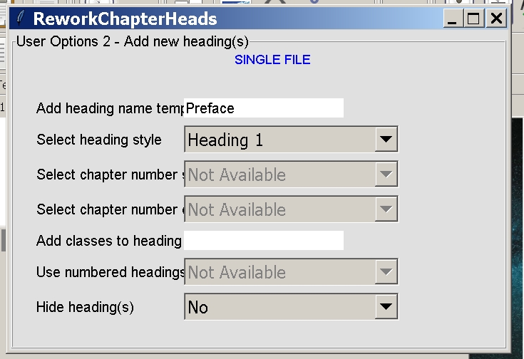 But think about users from other countries who prefer to have instead of "Chapter" e.g. "Kapitel", "Rozdział" or "Глава". My suggestion SAVES the typed word in Template input box when selecting multiple files, and "Preface" is used when selecting only one file. Ad "cleaning" options.SUFFIX_CHOICE. You're right, but not quite. For template "Chapter" all works. Change template to other word (write something else there). Then the word from the template is added, despite choosing "Use numbered headings only". Code: